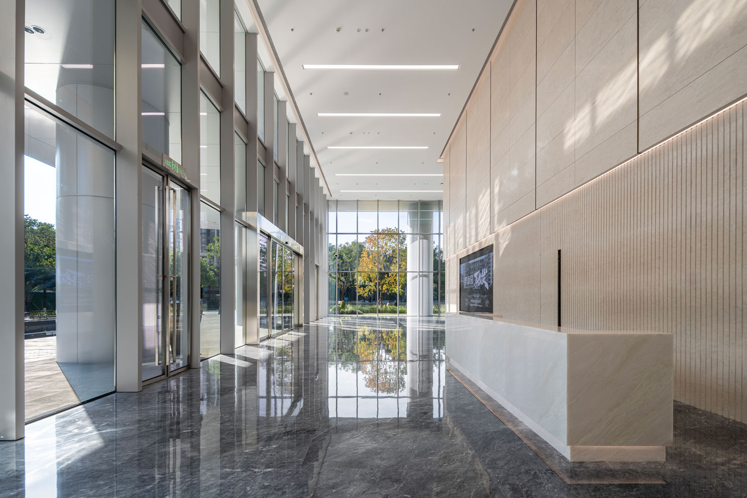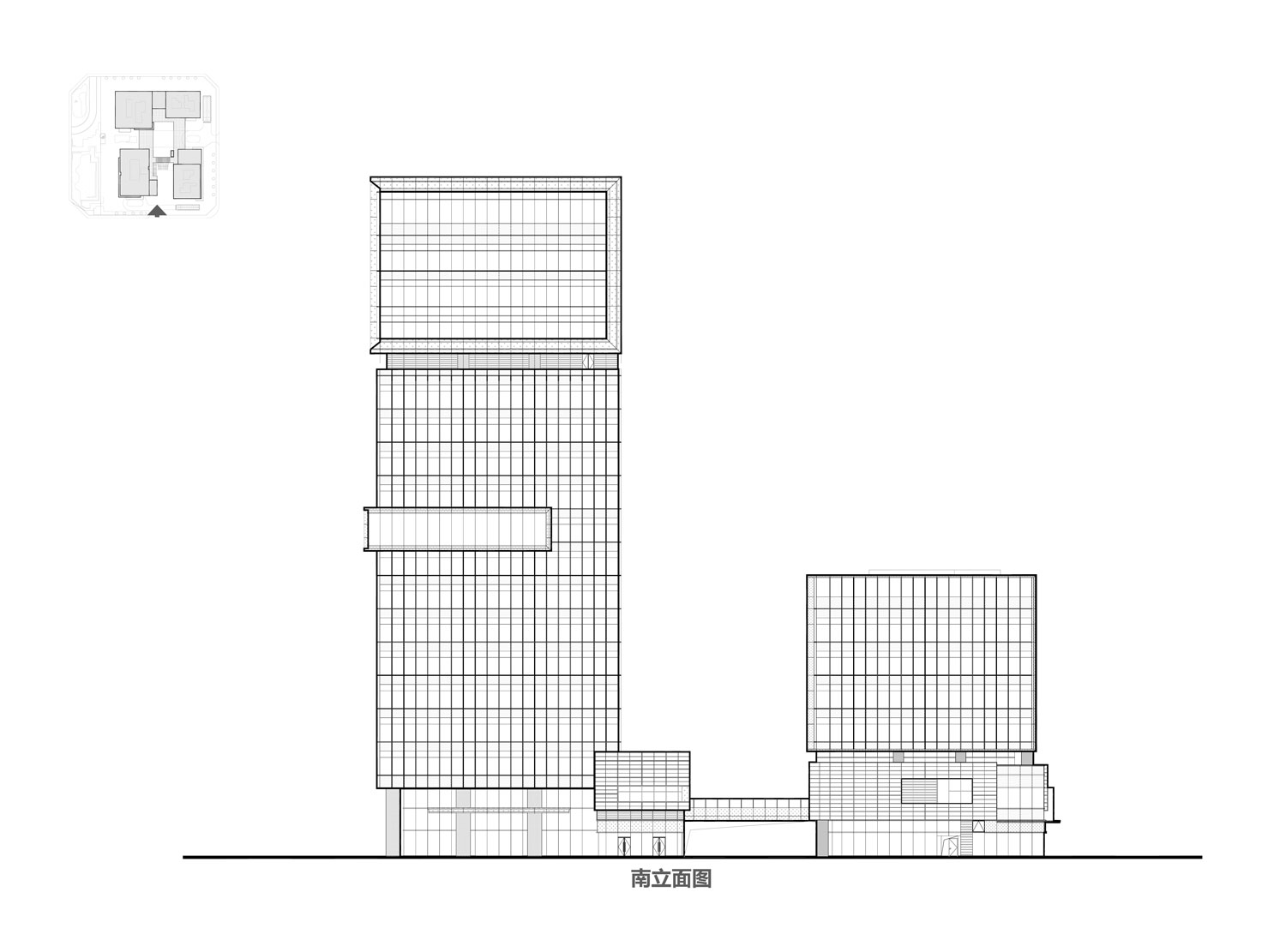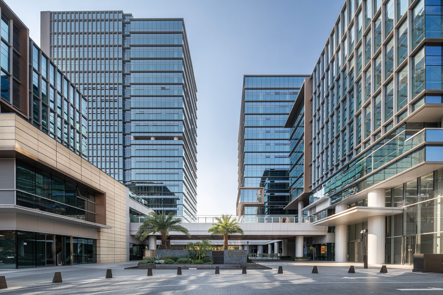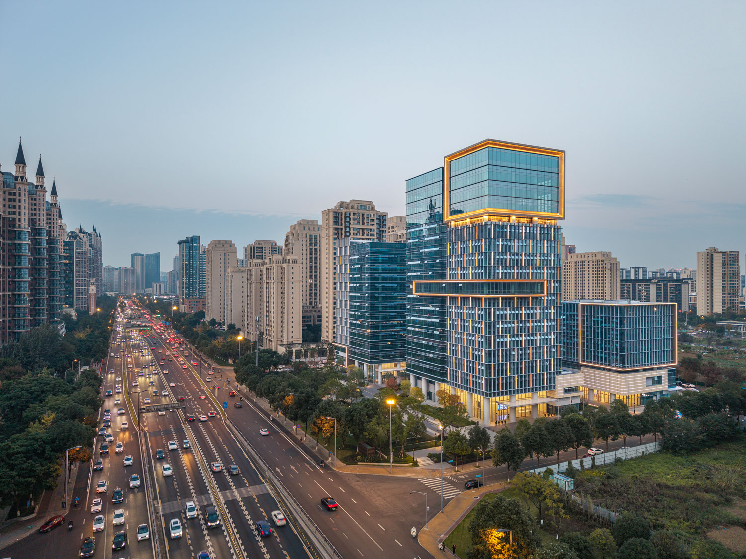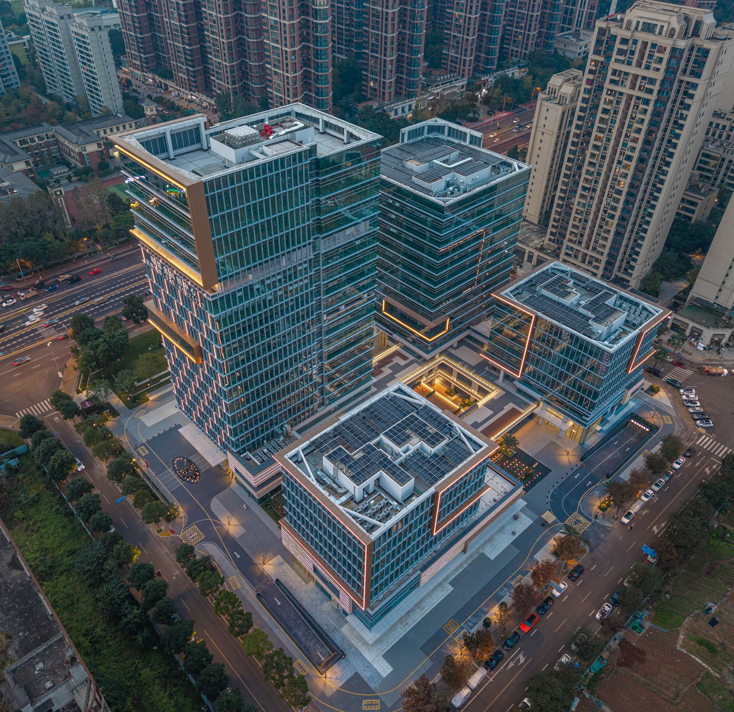 項(xiàng)目主要包括四棟辦公樓、裙房及中間圍合而成的廣場。高低錯(cuò)落的兩棟塔樓臨近西側(cè)城市主干道,另外兩棟低層辦公樓位于項(xiàng)目東側(cè)。四棟建筑形成錯(cuò)落有致的空間形態(tài)和連貫而豐富的城市天際線。標(biāo)志性的裸眼3D屏幕位于項(xiàng)目最高辦公樓的頂部,是宣傳、引流的高新之窗。