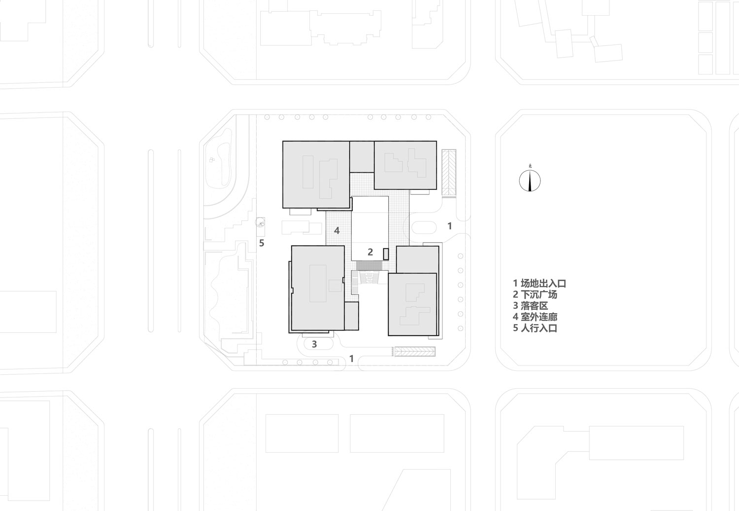 建筑面向城市打開,內(nèi)部設(shè)置一條自東向西的景觀軸,連通基地西側(cè)30米寬的城市綠地,引入人流的同時(shí)將城市綠帶轉(zhuǎn)變?yōu)榭偛炕毓珗@。建筑、自然、文化、商業(yè)在這里碰撞、交流。