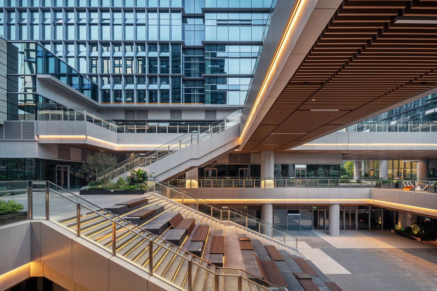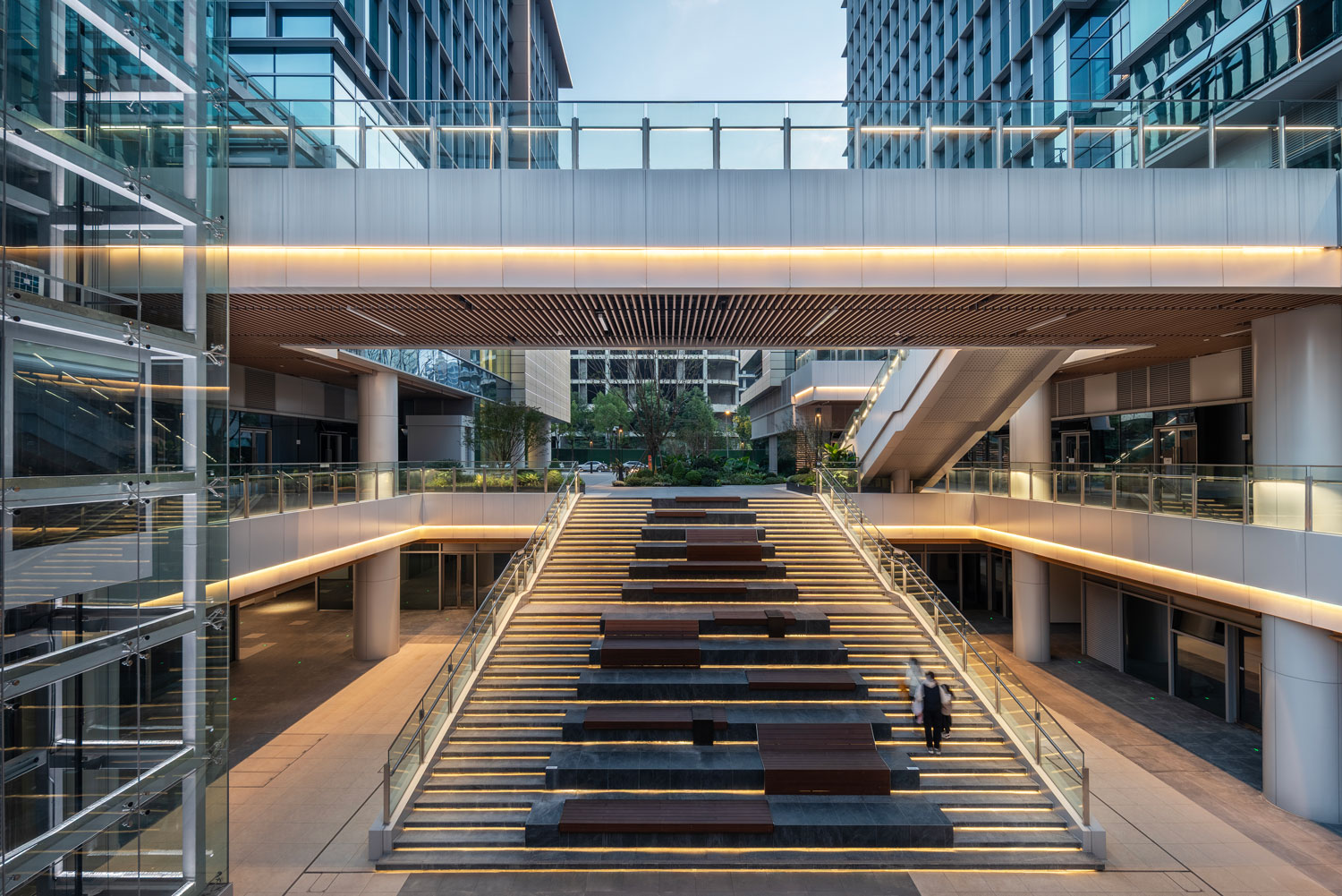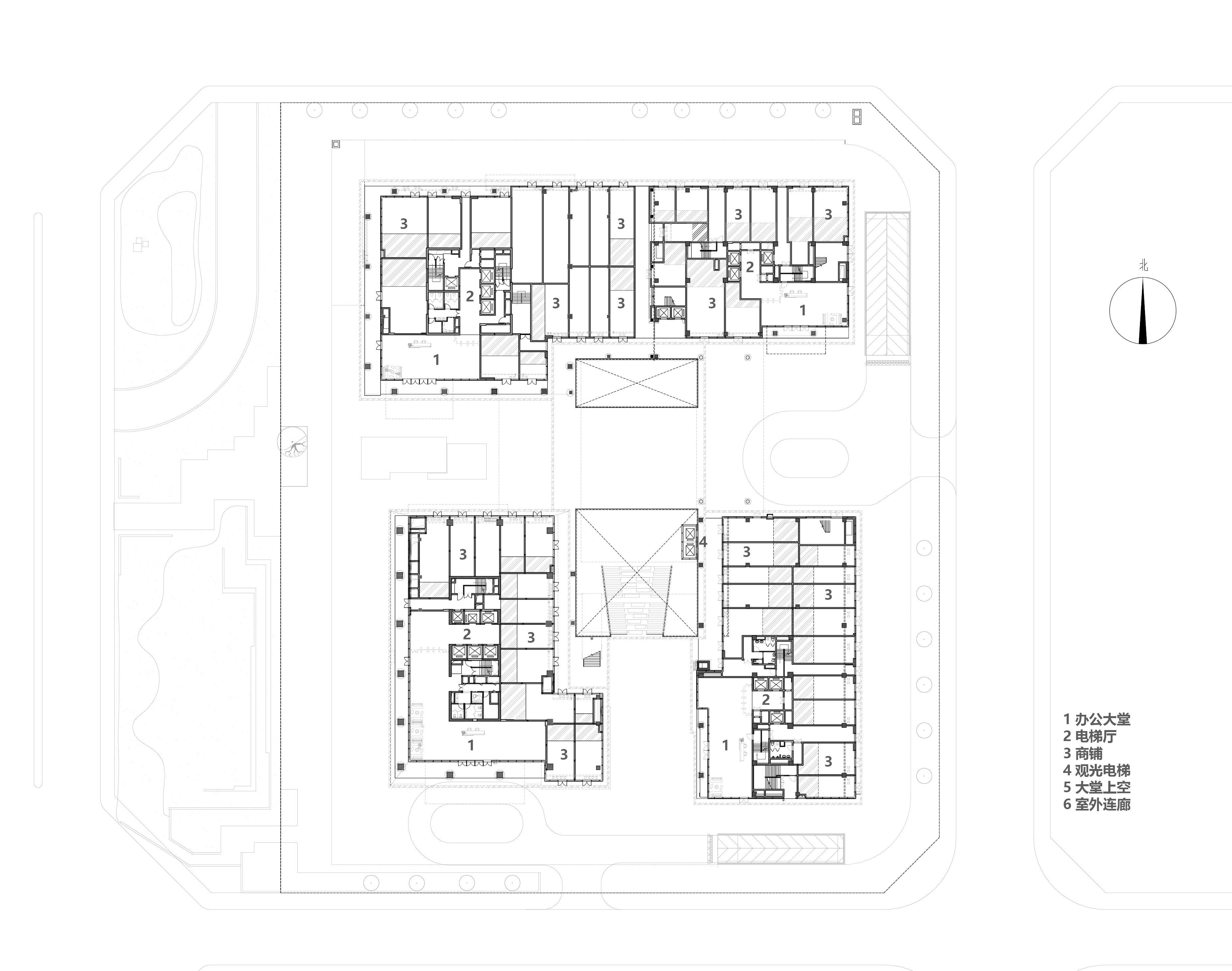 四棟辦公塔樓圍合,在基地內(nèi)部形成了一個(gè)以立體的步行空間為主導(dǎo)的下沉式商業(yè)廣場和城市花園,建筑內(nèi)部如會(huì)議洽談、發(fā)布會(huì)、藝術(shù)裝置等多種功能與城市聯(lián)系起來,多元化的業(yè)態(tài)承載著豐富的城市場景。
