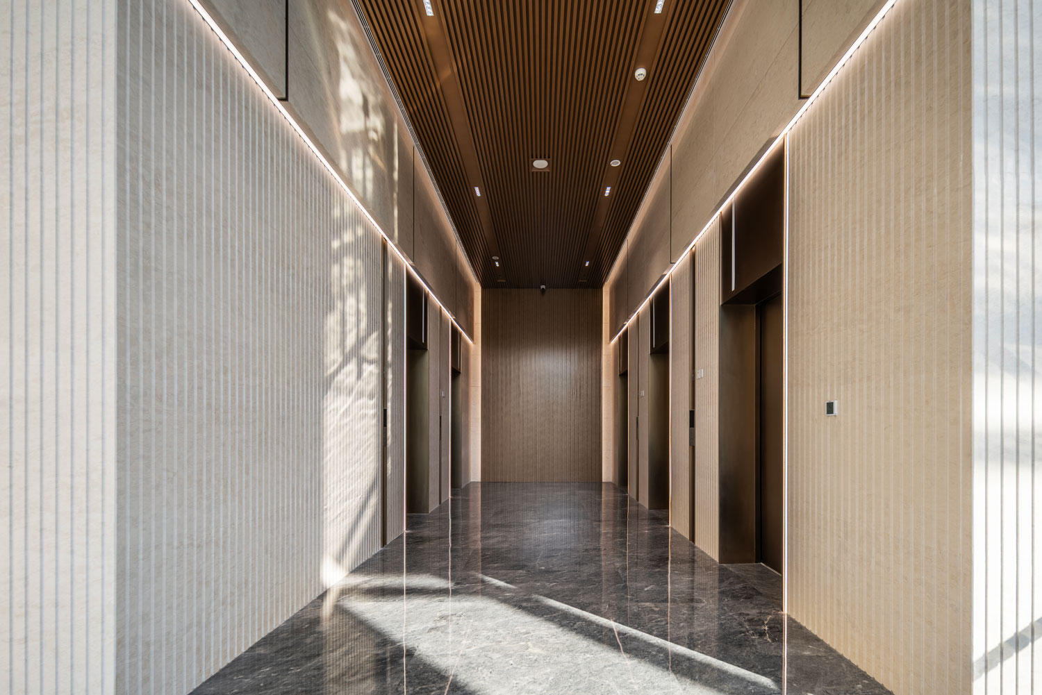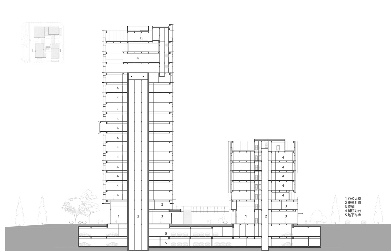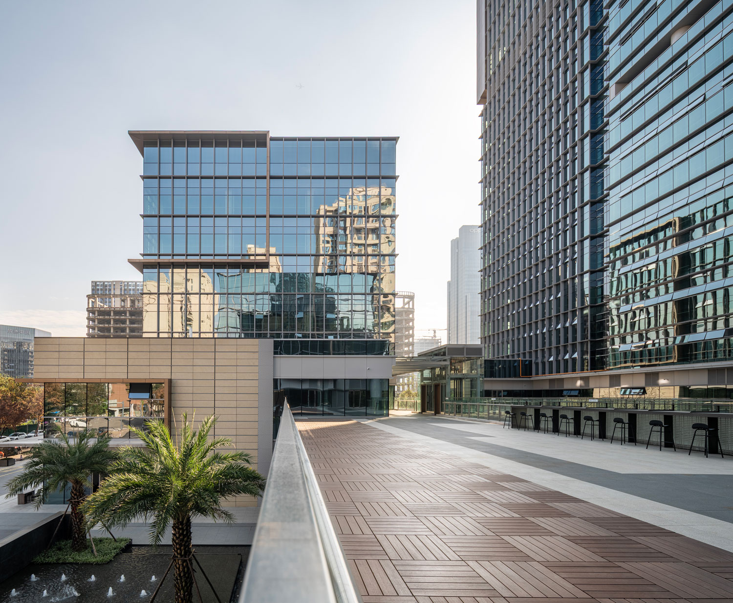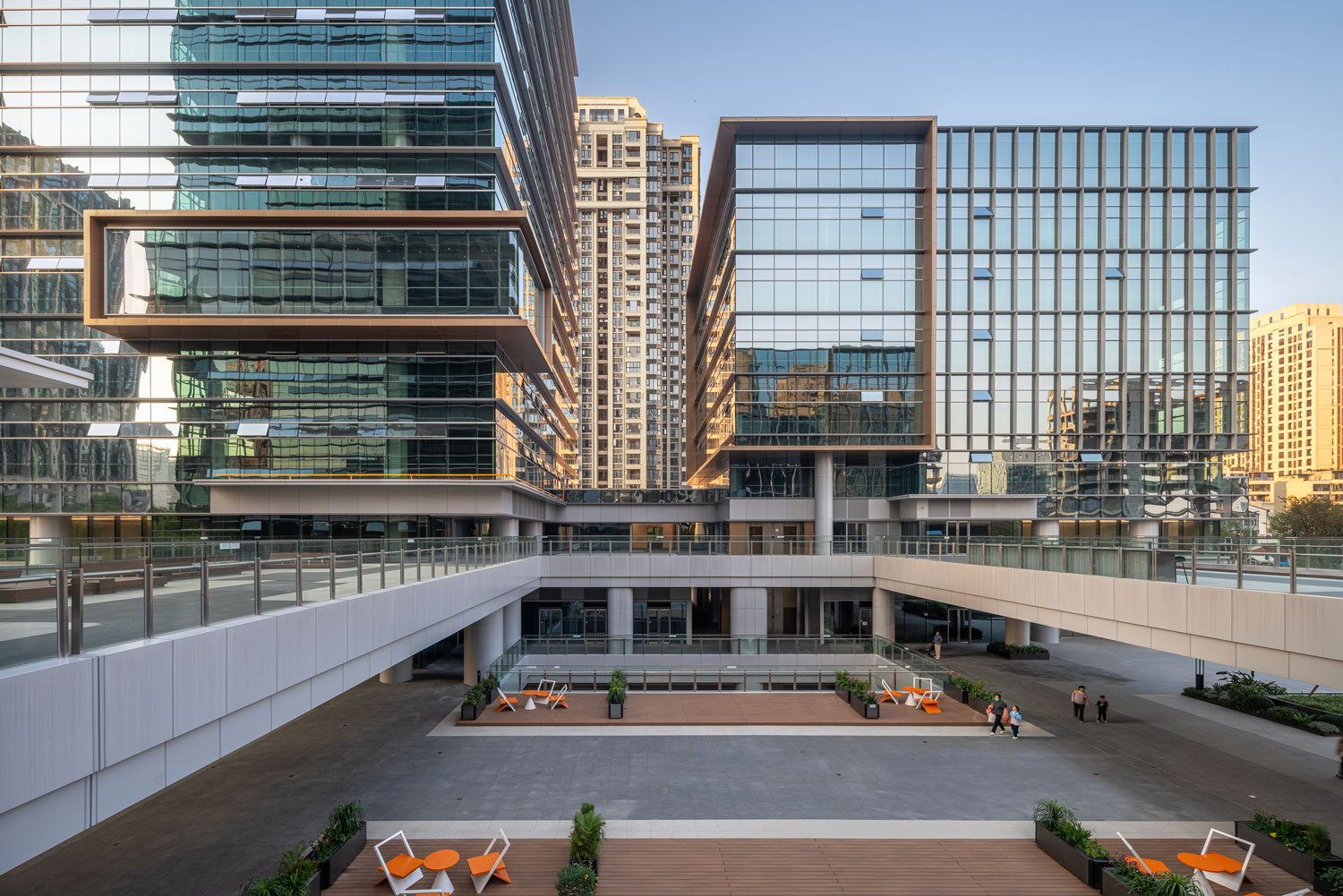 四棟辦公塔樓圍合,在基地內(nèi)部形成了一個(gè)以立體的步行空間為主導(dǎo)的下沉式商業(yè)廣場和城市花園,建筑內(nèi)部如會(huì)議洽談、發(fā)布會(huì)、藝術(shù)裝置等多種功能與城市聯(lián)系起來,多元化的業(yè)態(tài)承載著豐富的城市場景。