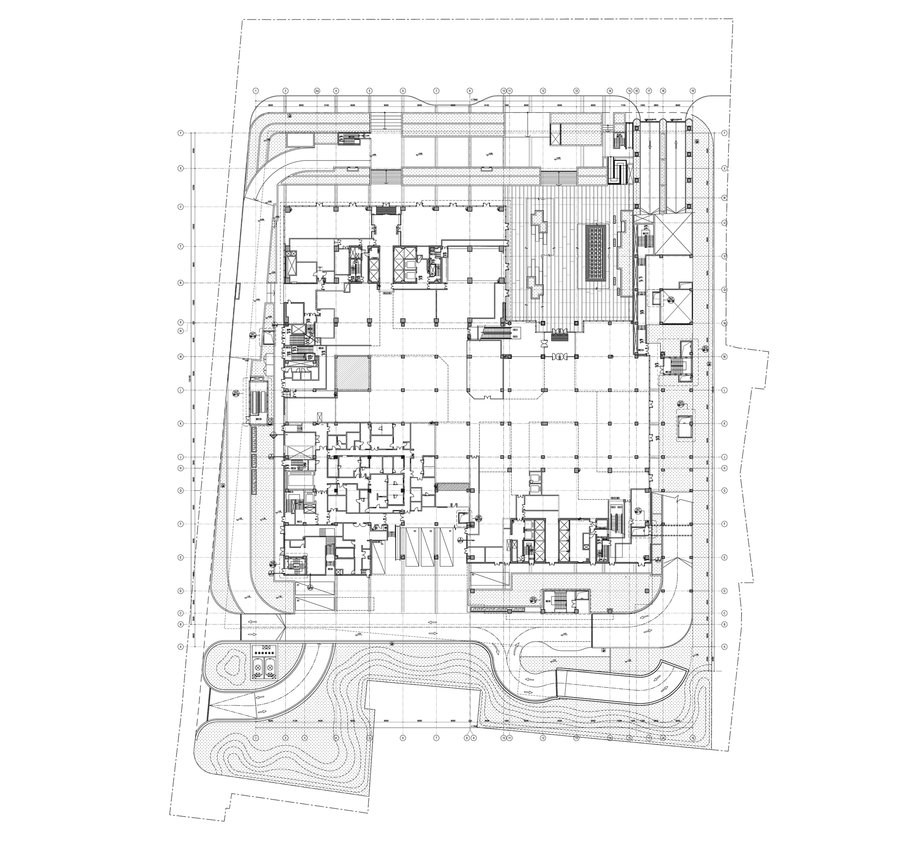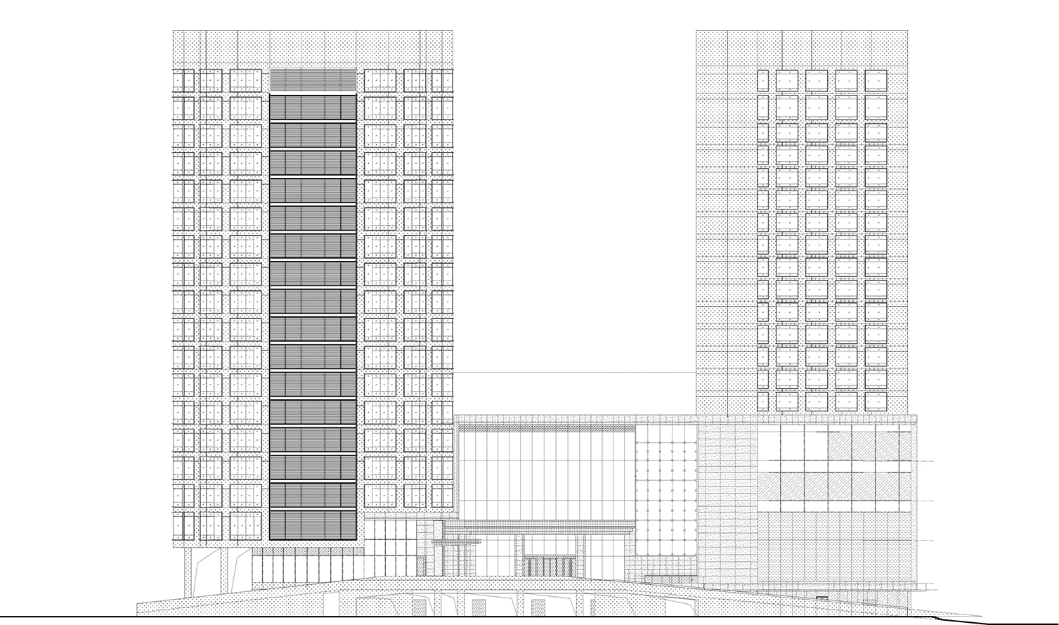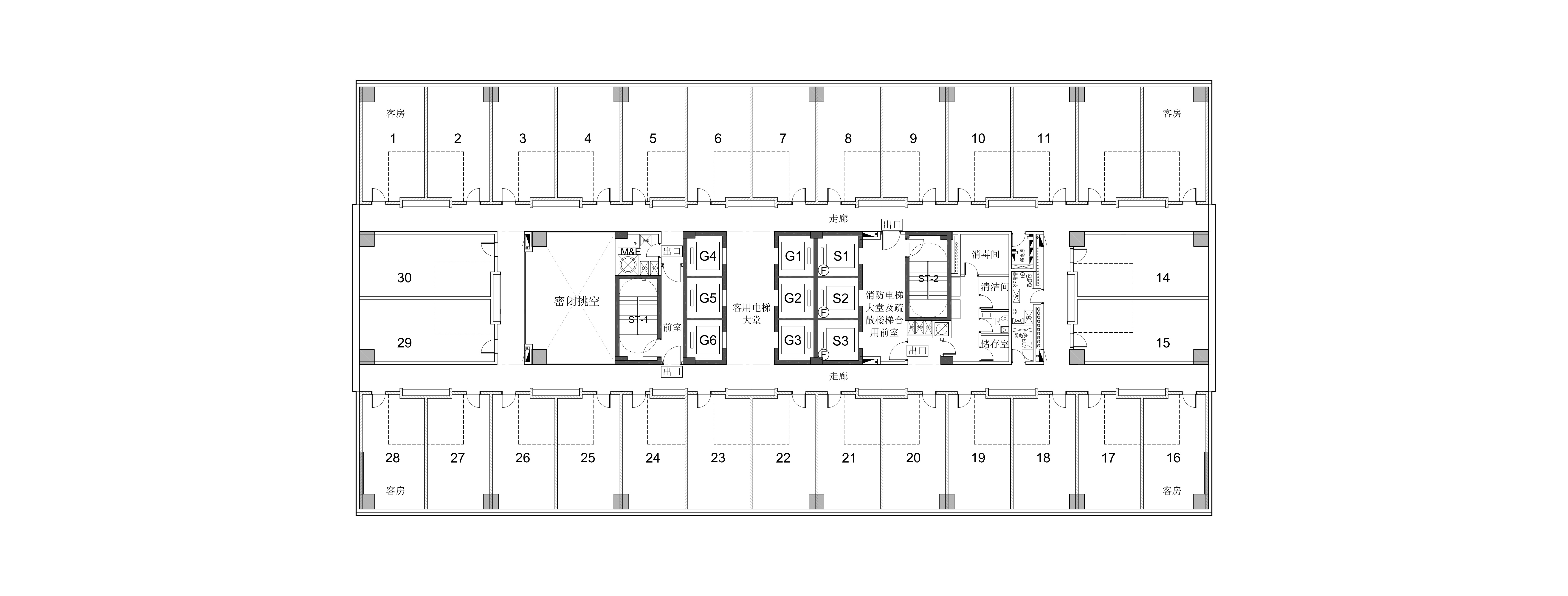 北側酒店塔樓面向泉城廣場, 使得客房居住者在盡享泉城廣場的同時, 亦可遠眺大明湖。酒店諸如餐飲等重要功能,亦能享受泉城廣場景色及首層室外綠化廣場景色。南側位置較幽靜,在布局上設置為辦公區(qū)域,主立面亦面向泉城廣場。兩棟建筑與其他周圍建筑保持適當距離, 避免由于間距過近而造成的互望弊端。