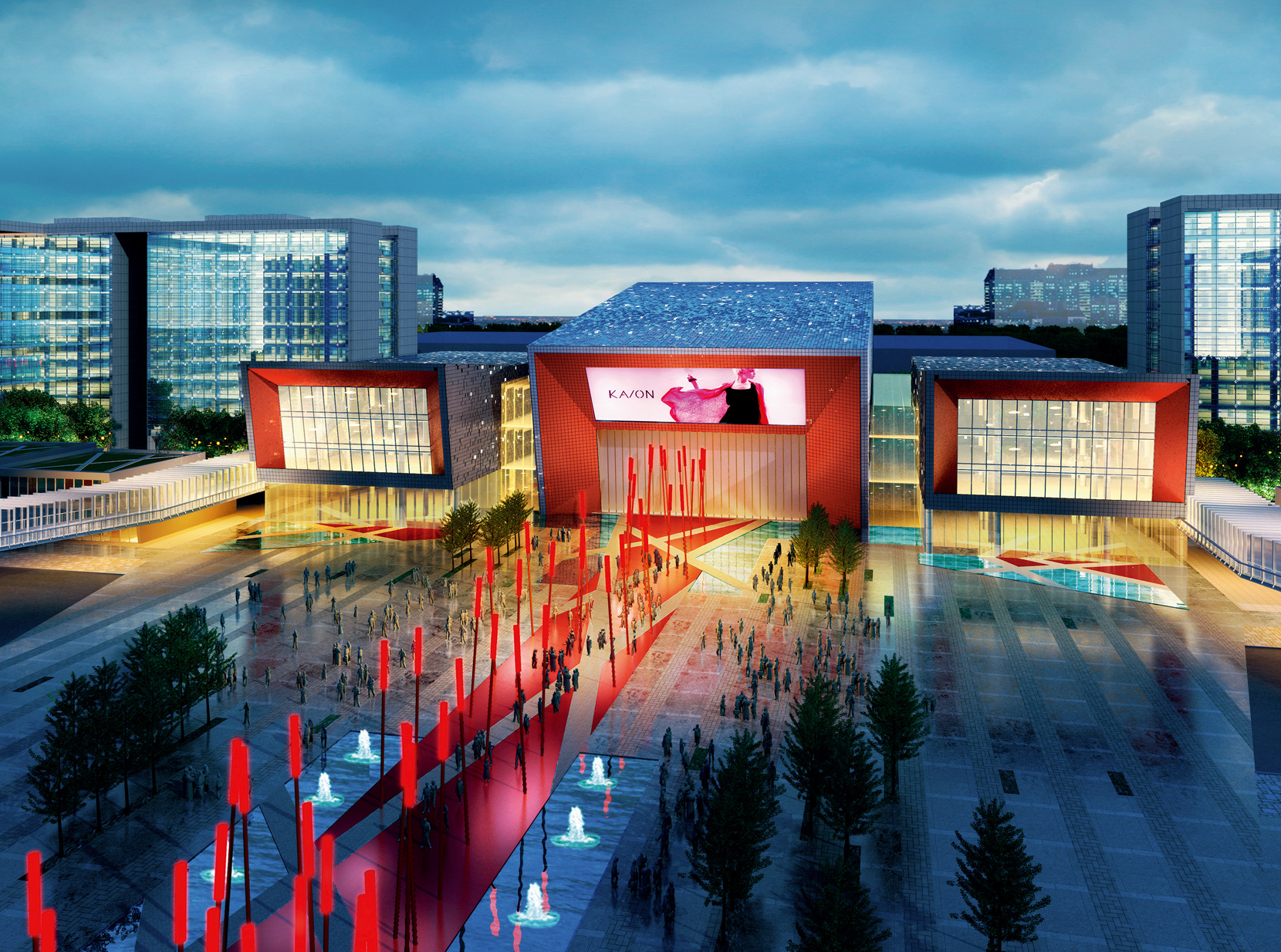 項(xiàng)目最大的演播廳單體面積達(dá)到3,300平方米,建成后將成為亞洲第一演播廳,其跨度近50米,縱向63米,此演播廳的大門史無前例地采用了類似飛機(jī)庫的大滑動(dòng)門設(shè)計(jì),高16米,寬32米。在演播廳使用時(shí),當(dāng)滑動(dòng)門緩緩拉開,室內(nèi)的演出和室外的觀眾將連成一體,形成極具視覺沖擊力的超級大舞臺(tái)。項(xiàng)目另外的一個(gè)亮點(diǎn)是占地面積約6,000平方米的星光廣場和一條紅地毯鋪就的星光大道。