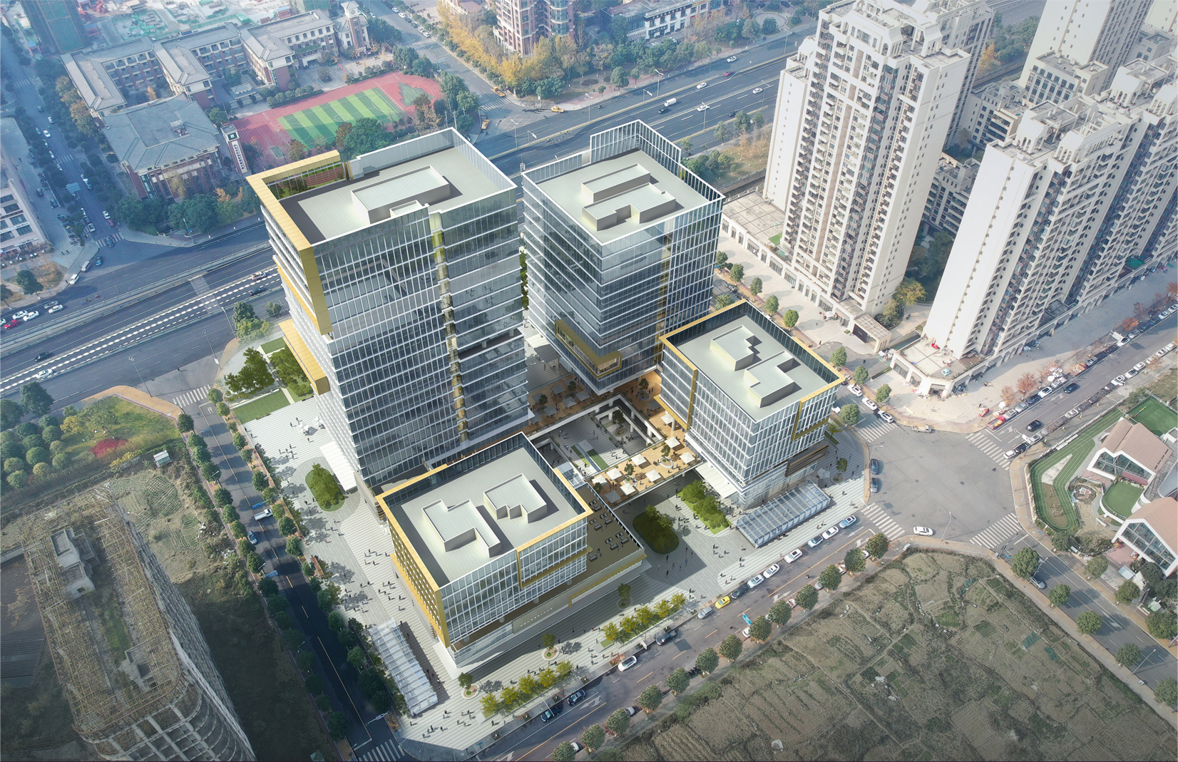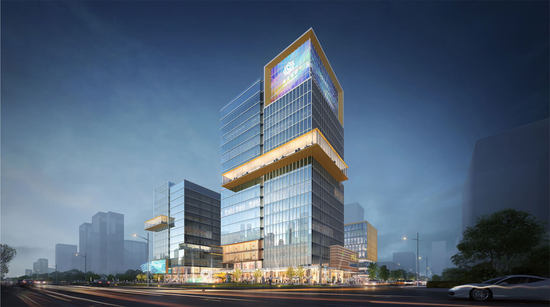 項(xiàng)目主要包括四棟辦公樓、裙房及中間圍合而成的廣場(chǎng)。高低錯(cuò)落的兩棟塔樓臨近西側(cè)城市主干道,另外兩棟低層辦公樓位于項(xiàng)目東側(cè)。四棟建筑形成錯(cuò)落有致的空間形態(tài)和連貫而豐富的城市天際線。標(biāo)志性的裸眼3D屏幕位于項(xiàng)目最高辦公樓的頂部,是宣傳、引流的高新之窗。