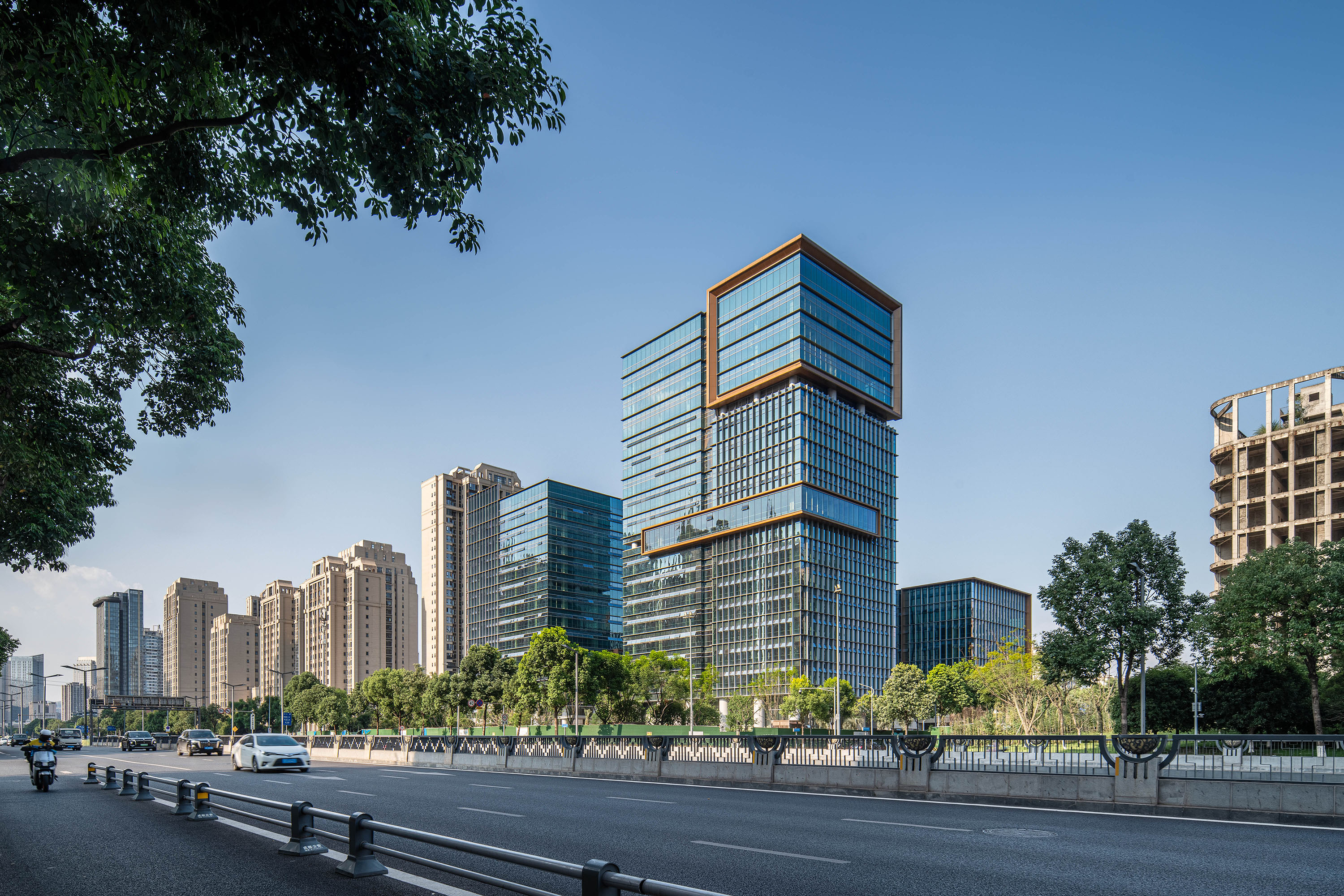 項(xiàng)目主要包括四棟辦公樓、裙房及中間圍合而成的廣場。高低錯(cuò)落的兩棟塔樓臨近西側(cè)城市主干道,另外兩棟低層辦公樓位于項(xiàng)目東側(cè)。四棟建筑形成錯(cuò)落有致的空間形態(tài)和連貫而豐富的城市天際線。標(biāo)志性的裸眼3D屏幕位于項(xiàng)目最高辦公樓的頂部,是宣傳、引流的高新之窗。