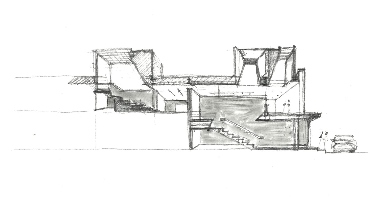 設(shè)計靈感源自現(xiàn)代主義畫作,運(yùn)用純粹幾何形體與自然光線來營造藝術(shù)氛圍。白色金屬板除嵌入主入口外,也被用作次入口雨棚并延續(xù)到屋面樓梯間及外擺區(qū),形成連續(xù)舒展的建筑形態(tài),賦予舊建筑強(qiáng)烈的標(biāo)識性和靈動感??缮先宋菝鏋閰⒂^者提供了室外活動場地和眺望森林公園的機(jī)會。另外,屋面增設(shè)了不同形狀的天窗,為室內(nèi)帶來自然采光變化,室內(nèi)功能布局也圍繞天窗展開。不同于封閉式展出方式,流動的光線讓展覽空間具有了生命力。