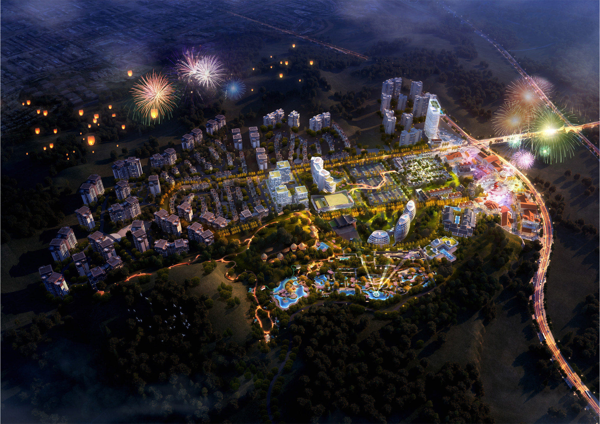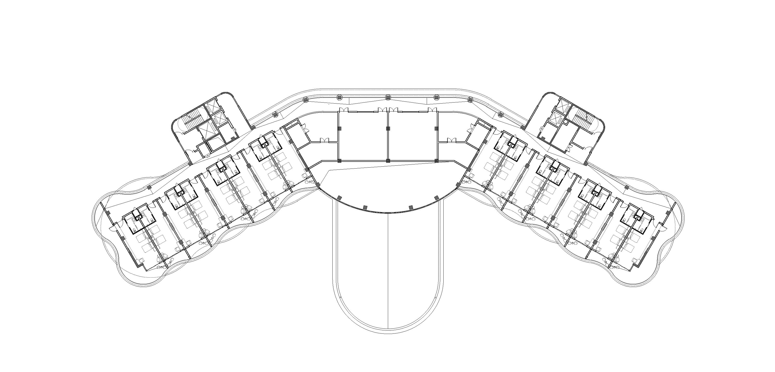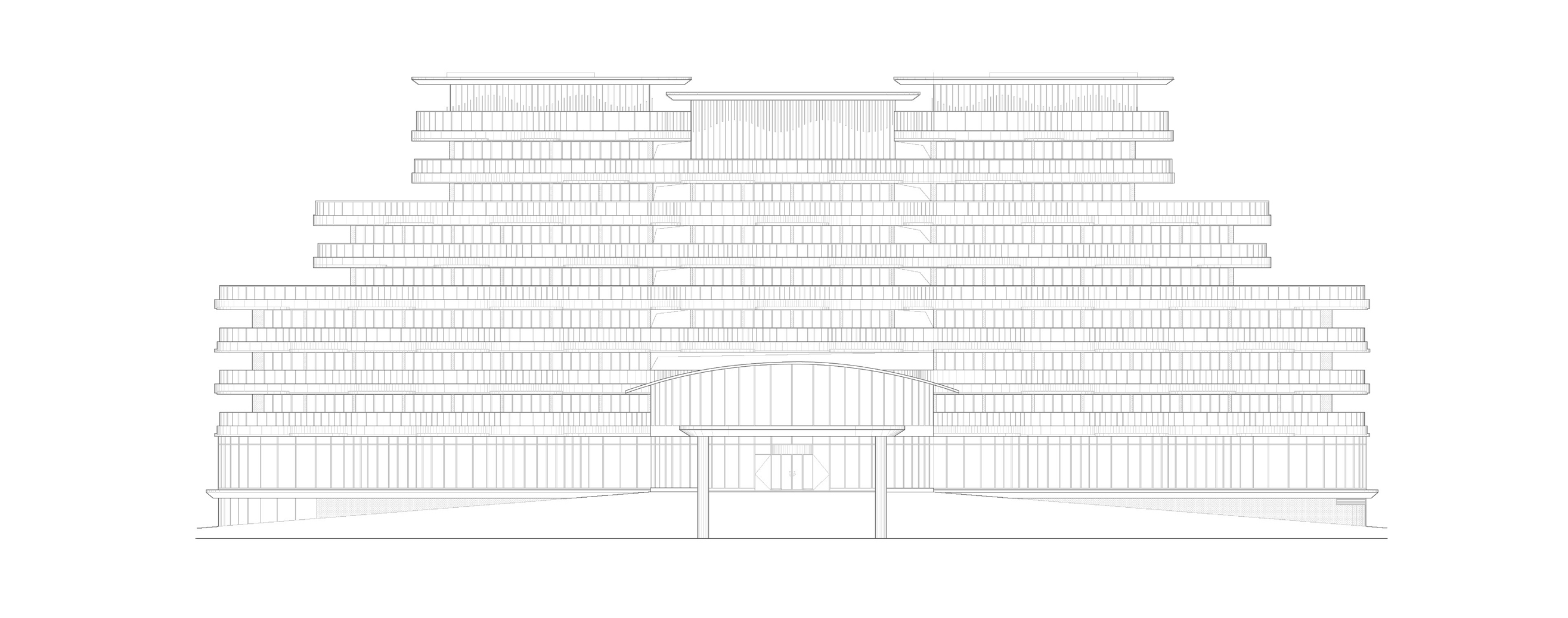 項(xiàng)目采取“一環(huán)雙核,一廊兩軸,多節(jié)點(diǎn),五大功能片區(qū)”的規(guī)劃形式。其中,南區(qū)以道路及山體為界,規(guī)劃形成五大功能片區(qū):絲路?琳瑯里、絲路?一千零一夜、絲路?云端溫泉海、絲路?甘泉谷和絲路?駝鈴灣。酒店位于“絲路?一千零一夜”片區(qū),結(jié)合絲路60國(guó)文旅論壇永久會(huì)址(國(guó)際會(huì)議中心)、溫泉服務(wù)中心(中國(guó)鹽鹵溫泉博覽館)、溫泉親子度假公寓、藝術(shù)之家(演出用品商場(chǎng)、演員公寓、商務(wù)酒店)等,打造成為奇域小鎮(zhèn)內(nèi)部的酒店會(huì)議集群。建筑以“絲綢之路”為主題進(jìn)行創(chuàng)作,既體現(xiàn)地域特色,又與歷史文化交融積淀,構(gòu)成過(guò)去與現(xiàn)代的共生,衍生出豐富多彩的建筑風(fēng)貌。同時(shí),建筑采用獨(dú)特的地貌紋理,提煉出作為建筑表皮元素與圖案的鮮明文化符號(hào)。