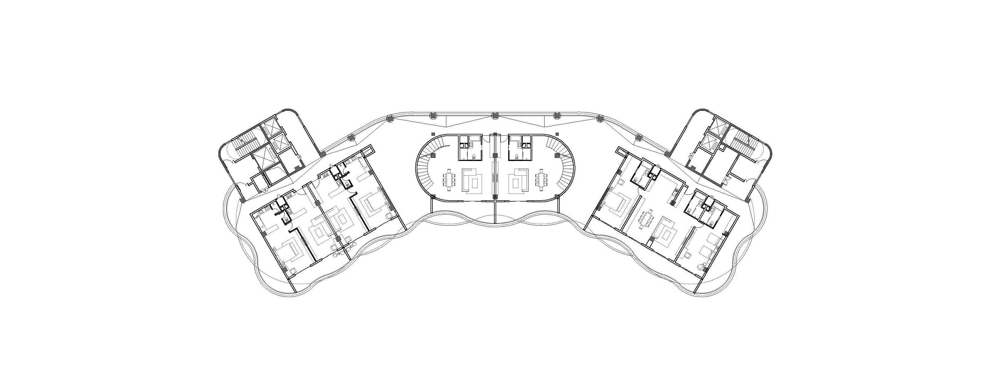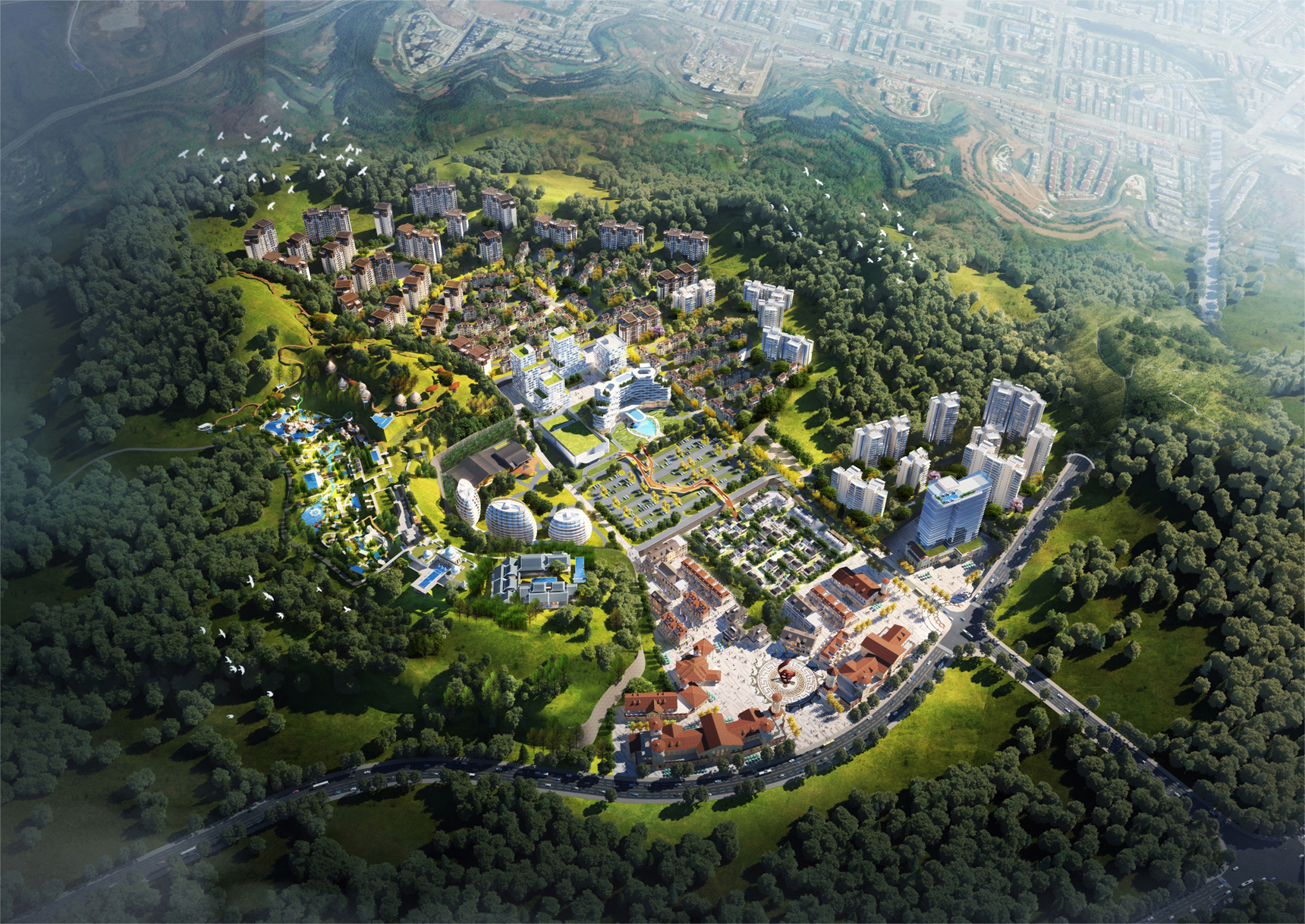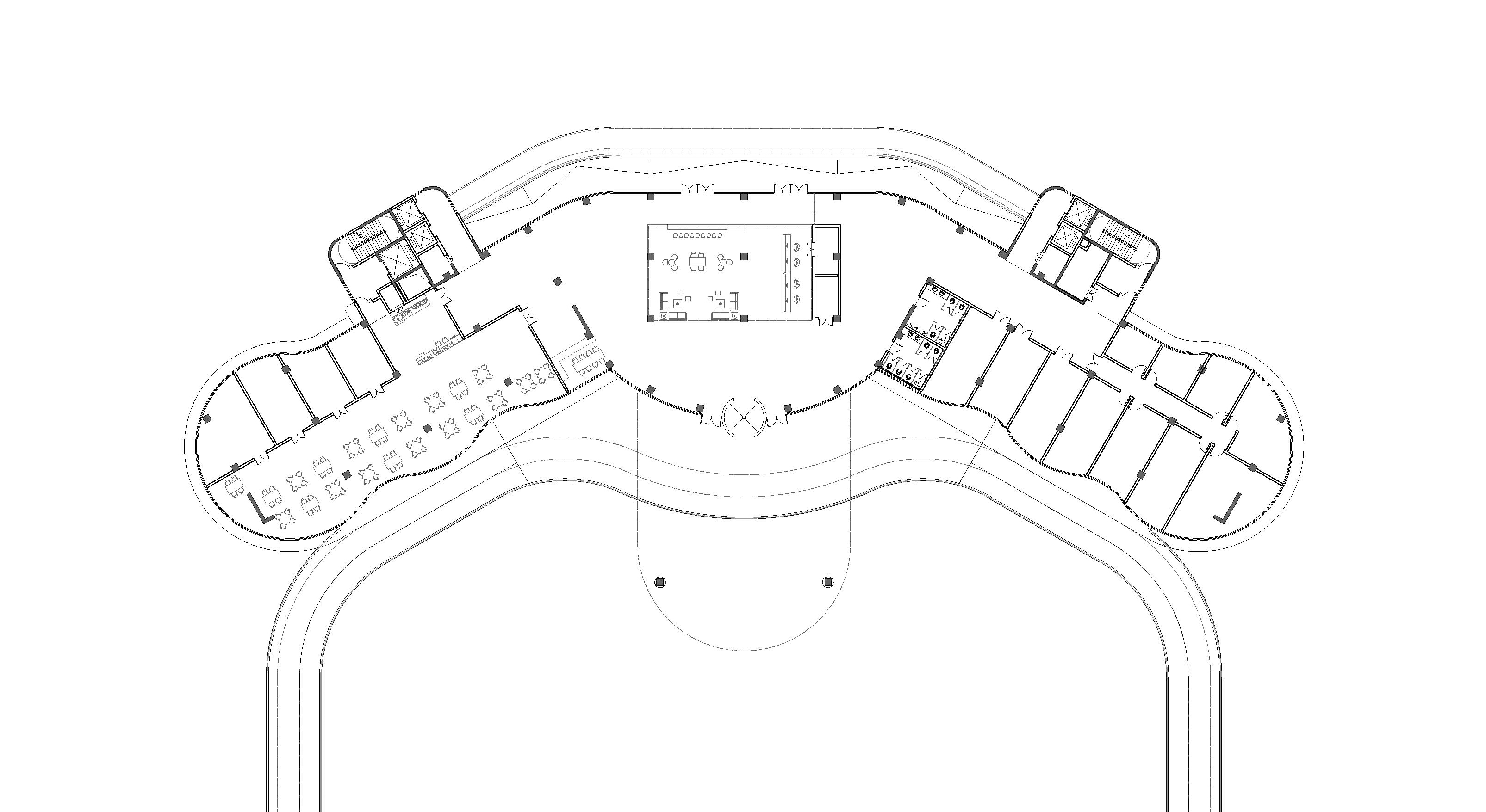 項(xiàng)目采取“一環(huán)雙核,一廊兩軸,多節(jié)點(diǎn),五大功能片區(qū)”的規(guī)劃形式。其中,南區(qū)以道路及山體為界,規(guī)劃形成五大功能片區(qū):絲路?琳瑯里、絲路?一千零一夜、絲路?云端溫泉海、絲路?甘泉谷和絲路?駝鈴灣。酒店位于“絲路?一千零一夜”片區(qū),結(jié)合絲路60國(guó)文旅論壇永久會(huì)址(國(guó)際會(huì)議中心)、溫泉服務(wù)中心(中國(guó)鹽鹵溫泉博覽館)、溫泉親子度假公寓、藝術(shù)之家(演出用品商場(chǎng)、演員公寓、商務(wù)酒店)等,打造成為奇域小鎮(zhèn)內(nèi)部的酒店會(huì)議集群。建筑以“絲綢之路”為主題進(jìn)行創(chuàng)作,既體現(xiàn)地域特色,又與歷史文化交融積淀,構(gòu)成過(guò)去與現(xiàn)代的共生,衍生出豐富多彩的建筑風(fēng)貌。同時(shí),建筑采用獨(dú)特的地貌紋理,提煉出作為建筑表皮元素與圖案的鮮明文化符號(hào)。