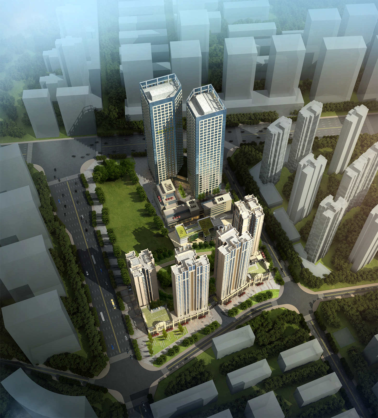 項(xiàng)目旨在打造城市中心區(qū)域的多功能復(fù)合、充滿朝氣和活力的居住、辦公、生活配套及學(xué)前教育綜合體,妥善處理四個(gè)功能的總體布局與空間層次關(guān)系,塑造地標(biāo)性建筑的立面風(fēng)貌,提升區(qū)域品質(zhì)。項(xiàng)目最富特色的辦公樓立面通過解構(gòu)主義手法突出建筑現(xiàn)代、時(shí)尚、創(chuàng)新的風(fēng)貌。辦公樓連接體造型取自握手的形態(tài),寓意和諧、友善的氛圍;外墻材料為玻璃幕墻結(jié)合白色穿孔鋁板的組合形式,減少幕墻比例,增加建筑的厚實(shí)感和韻律感??傮w效果整體協(xié)調(diào),局部統(tǒng)一、特點(diǎn)突出,別有風(fēng)貌。