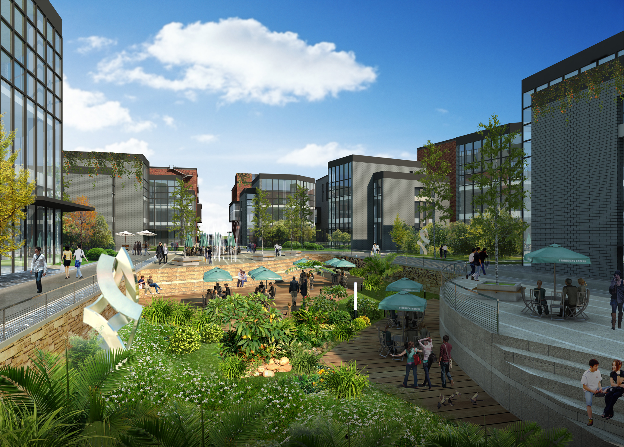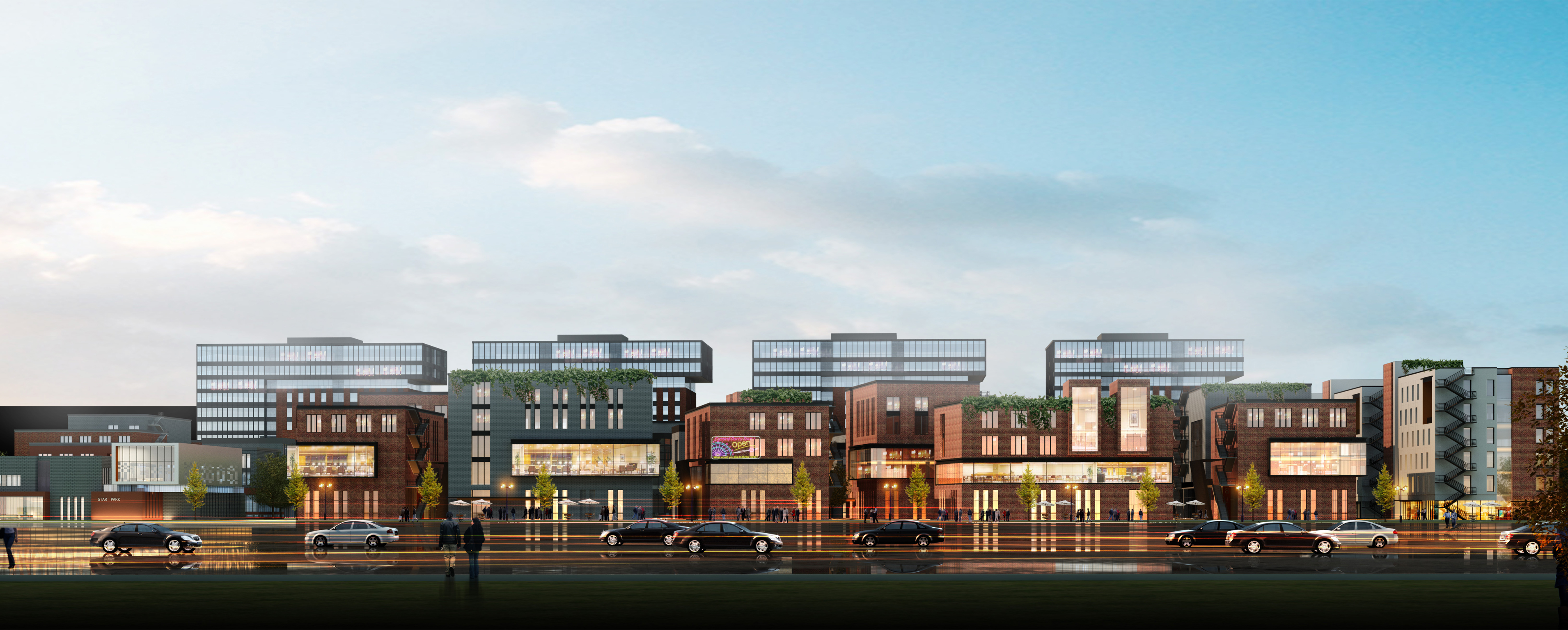 本項(xiàng)目位于北京市大興區(qū)西紅門鎮(zhèn),星光影視基地二期南側(cè)。項(xiàng)目占地約6公頃,總建筑面積約16萬平方米,其中地上建筑面積12萬平方米左右。項(xiàng)目集結(jié)高端辦公建筑群、主題演播場館、青年創(chuàng)業(yè)中心、特色商業(yè)中心四大板塊,實(shí)現(xiàn)了三種業(yè)態(tài),四大核心功能助力產(chǎn)業(yè)鏈條全面發(fā)展的新格局。下沉式的廣場設(shè)計(jì),在增強(qiáng)通達(dá)性與空間層次的同時,也提升了商業(yè)價值。4.2米的層高設(shè)計(jì),也滿足特殊辦公設(shè)備對層高的要求。規(guī)劃由十棟建筑分別圍合形成2.5個組團(tuán),每個組團(tuán)擁有各自不同的空間感受,以穿過用地的規(guī)劃路為界,西側(cè)組團(tuán)圍合性相對較強(qiáng),中間及東側(cè)半個組團(tuán)相對開放。主要景觀軸線與星光二期主演播廳相對,由入口廣場、下沉廣場臺階和廣場噴泉構(gòu)成,空間秩序感強(qiáng)烈,創(chuàng)造出豐富立體的景觀空間。