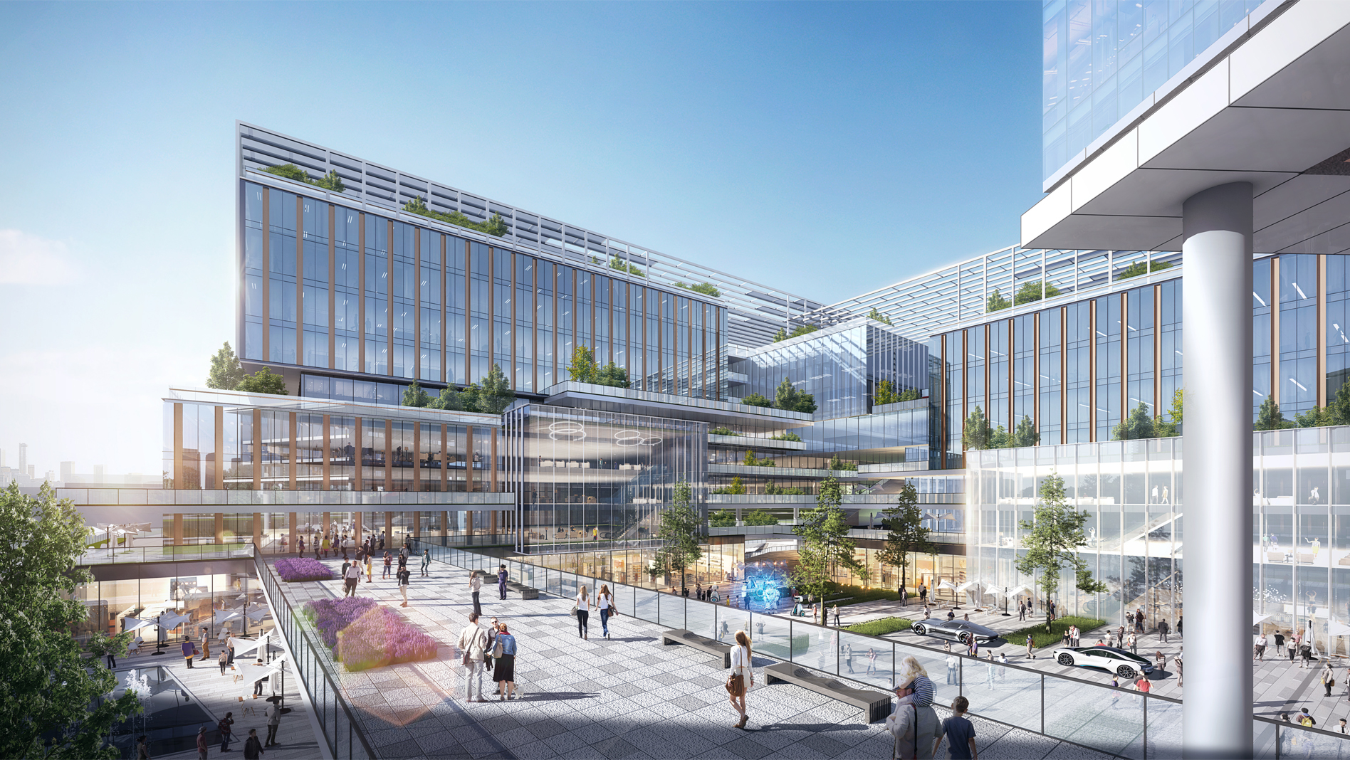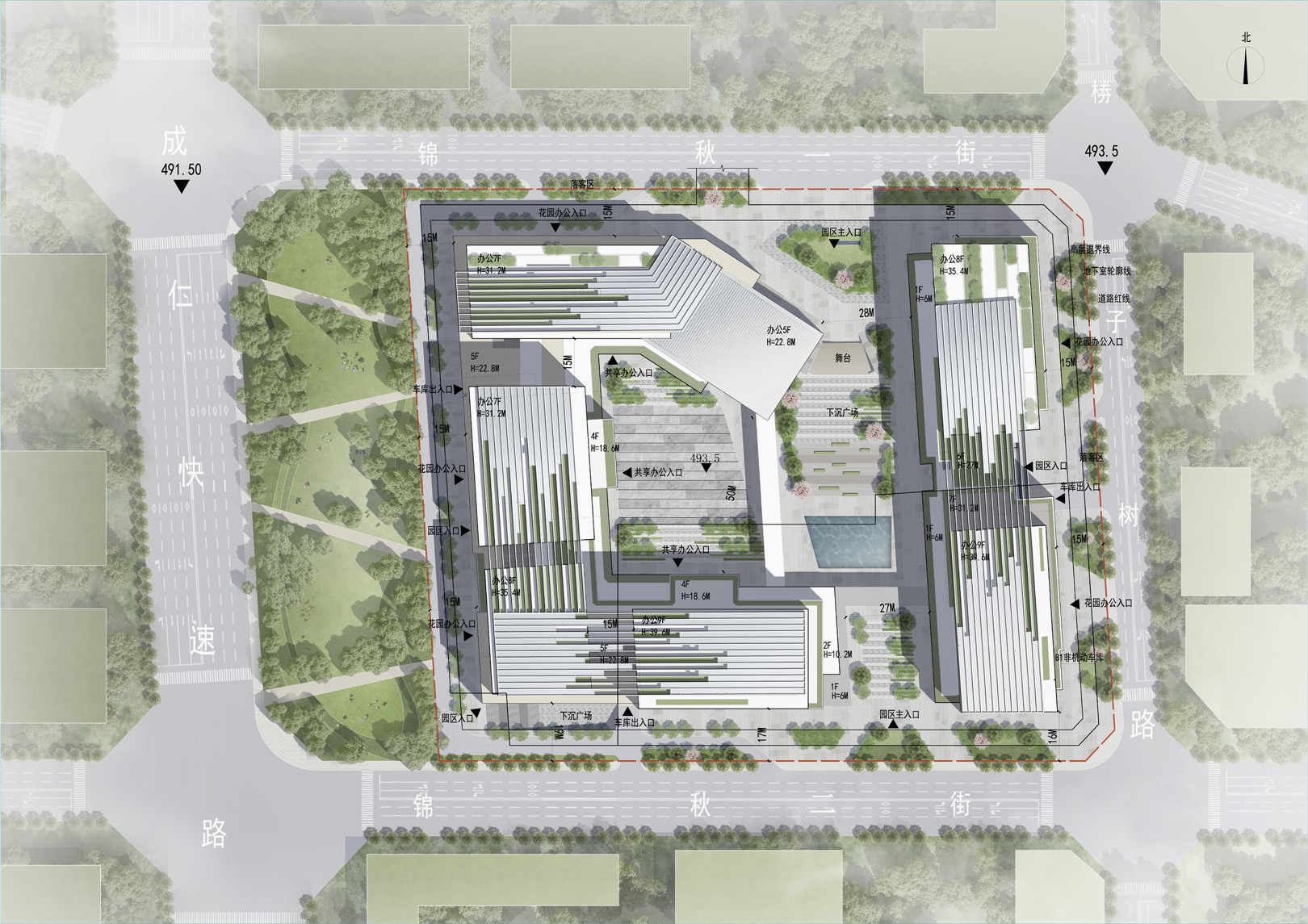 項(xiàng)目距成都市中心僅10分鐘車程,雙流國際機(jī)場20分鐘車程,6分鐘可到達(dá)成都東站。項(xiàng)目充分挖掘土地價(jià)值,通過城市界面與景觀資源的軸線對(duì)接與滲透,實(shí)現(xiàn)資源最佳匹配,保證園區(qū)創(chuàng)新性、互動(dòng)性、生態(tài)性的最大化體現(xiàn)。立體層面劃分不同性質(zhì)功能使用,引入多層次垂直綠化體系,通過不同功能使用性質(zhì)的豎向分區(qū),打造互動(dòng)融合、活力高效的產(chǎn)業(yè)空間。